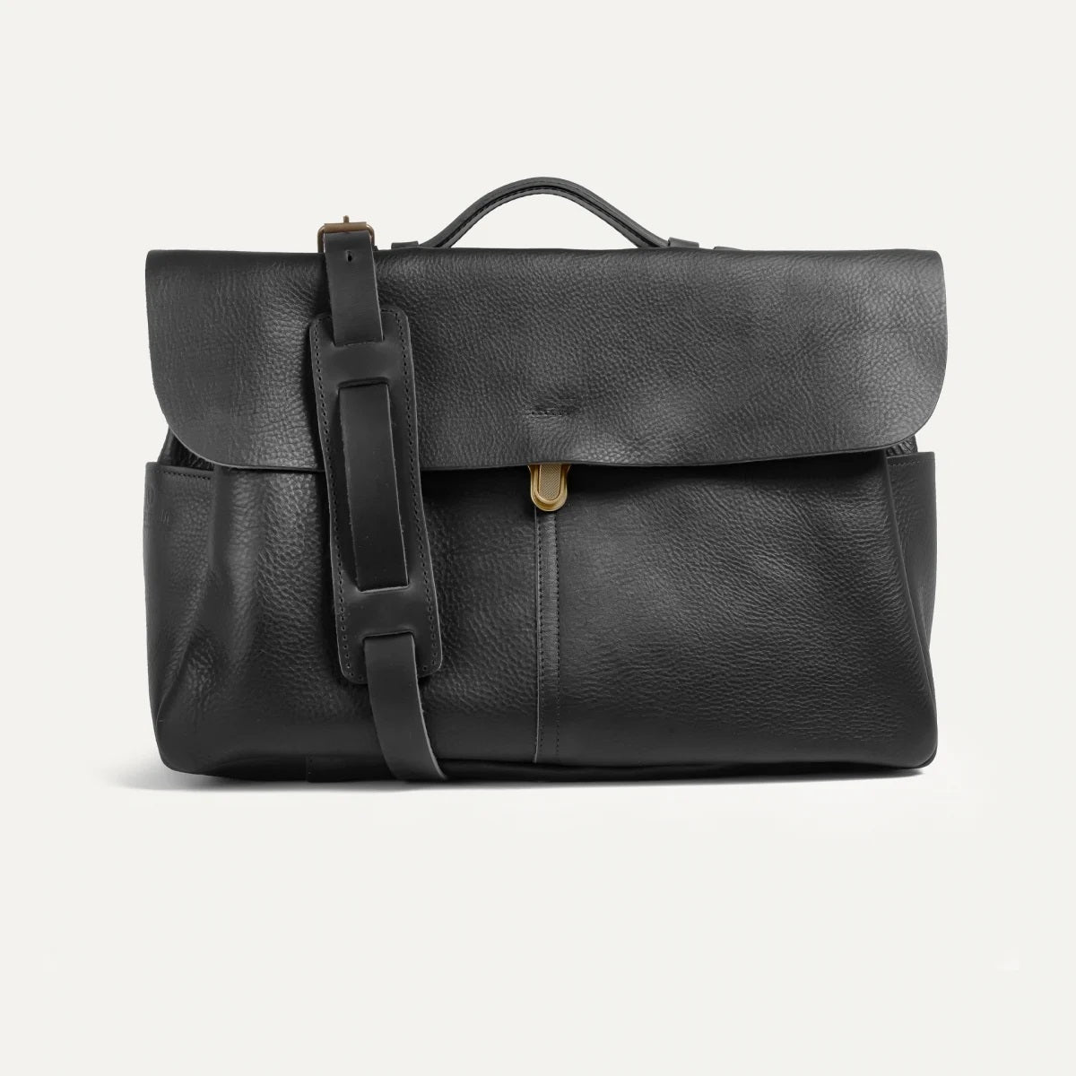 Der Überschlag ist im Bereich des Tragegriffs zusätzlich doppelt mit Leder unterlegt und verleiht der Tasche so mehr Stabilität und Form. Auf der Rückseite befindet sich eine große Reißverschlusstasche, die gleichzeitig als Trolley-Schlaufe genutzt werden kann. Verschlossen wird die Tasche über den charakteristischen Metallverschluss – ein funktionales Detail mit markanter, handwerklicher Anmutung.