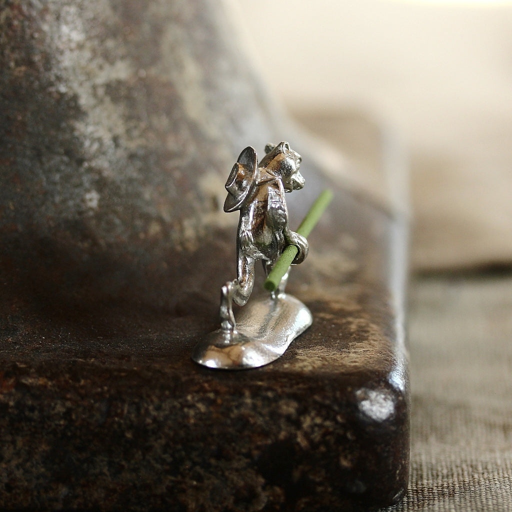 Die kleine Affenfigur greift dieses historische Motiv auf und übersetzt es in ein schlichtes, dekoratives Alltagsobjekt. Der Halter nimmt ein dünnes Räucherstäbchen auf und sorgt dafür, dass es sicher und stabil abbrennt. Durch die reduzierte Form und das matte Zinn wirkt das Objekt zugleich ruhig und charaktervoll.