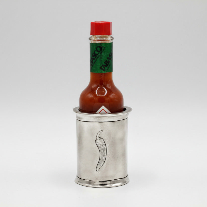Dieser stilvolle Tabasco Ständer ist die perfekte Ergänzung für jede Küche und jeden gedeckten Tisch. Gefertigt aus hochwertigem, handgegossenem Zinn, überzeugt er durch seine schlichte Eleganz und ein liebevoll gearbeitetes Detail in Form einer Chili-Gravur.