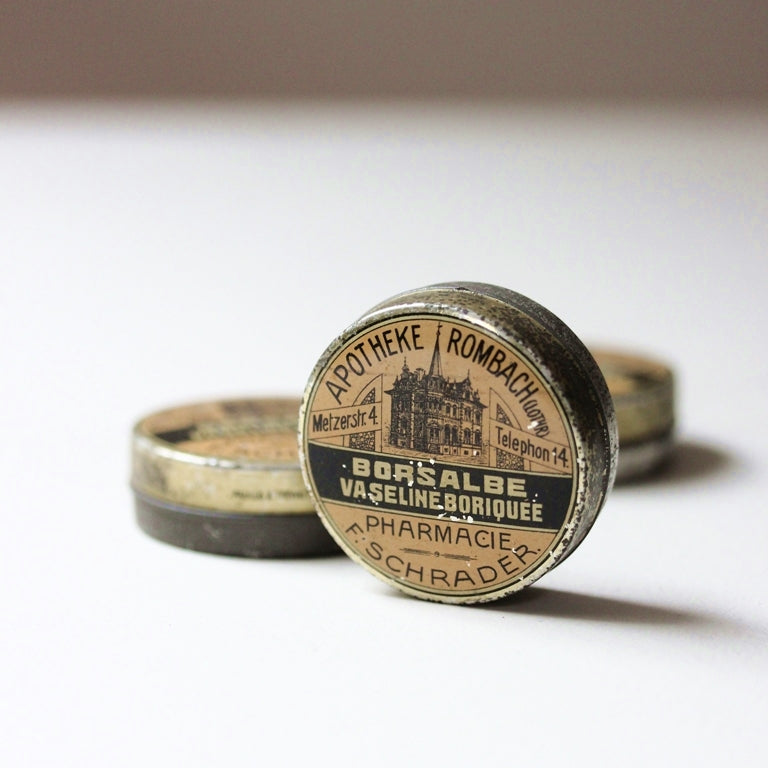 Ursprünglich diente die Dose zur Aufbewahrung von Borsalbe auf Vaselinebasis – ein damals verbreitetes Mittel zur äußeren Anwendung. Heute überzeugt sie vor allem als dekoratives Sammlerstück mit authentischer Patina und grafischer Präsenz.