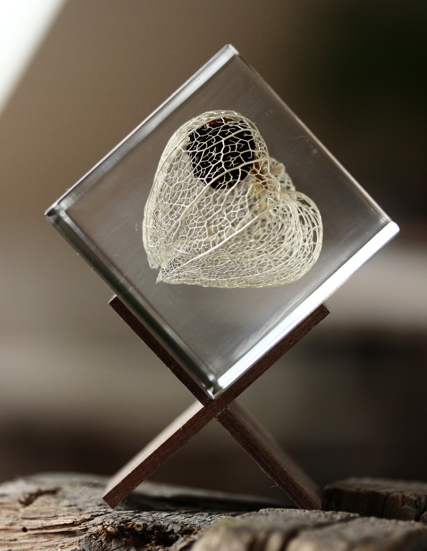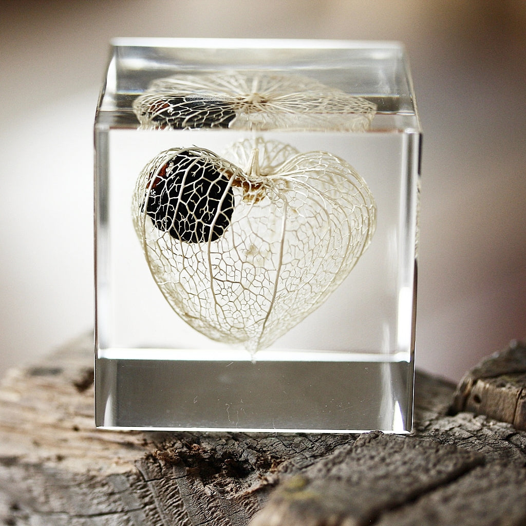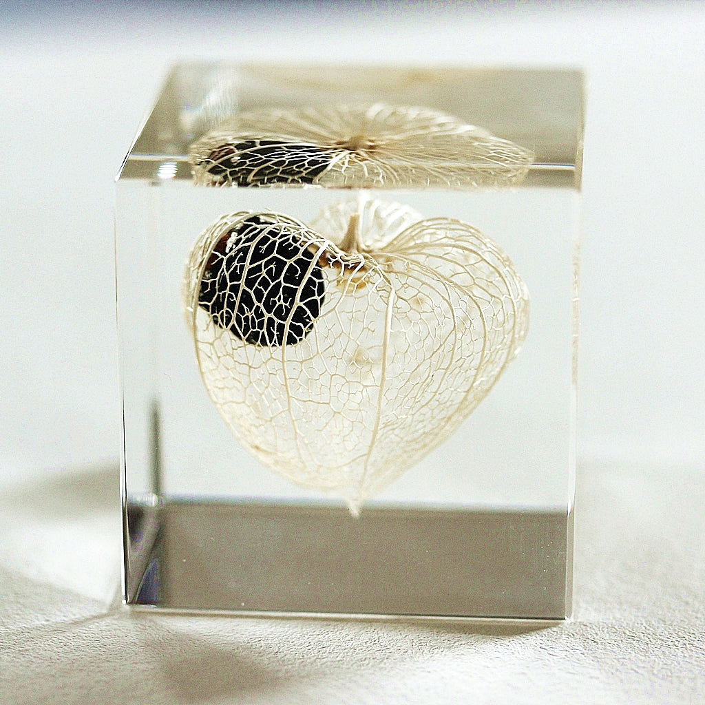 Die zarten, skelettartigen Adern der getrockneten Frucht bleiben dauerhaft erhalten – eingefangen in einem klaren Würfel aus Acrylharz. Ein kleines Universum in transparenter Form.