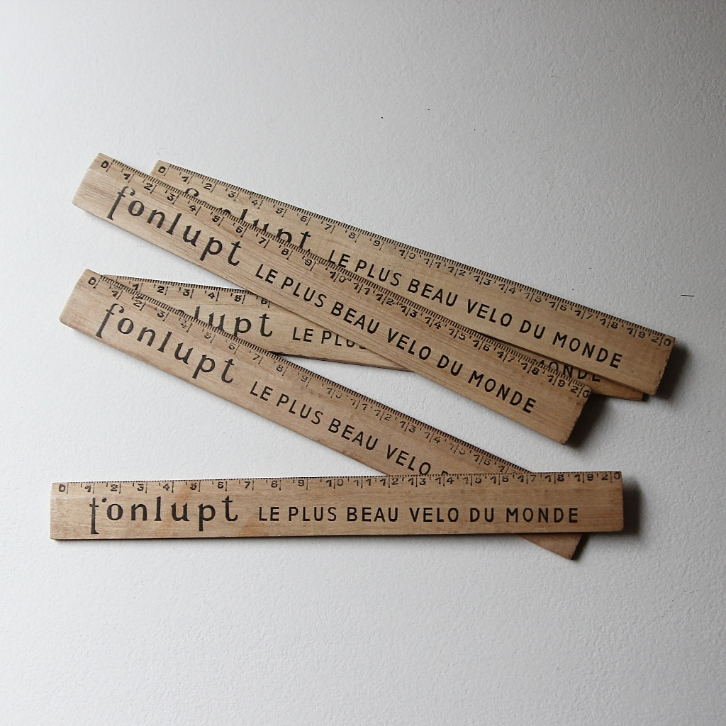 Diese Vintage-Holzlineale aus Frankreich stammen aus den 1950er Jahren und wurden ursprünglich als Werbemittel für die Fahrradmarke Fonlupt gefertigt. Der prägnante Schriftzug „LE PLUS BEAU VELO DU MONDE“ – „Das schönste Fahrrad der Welt“ – verleiht den Linealen eine charmante, selbstbewusste Note vergangener Werbekultur.