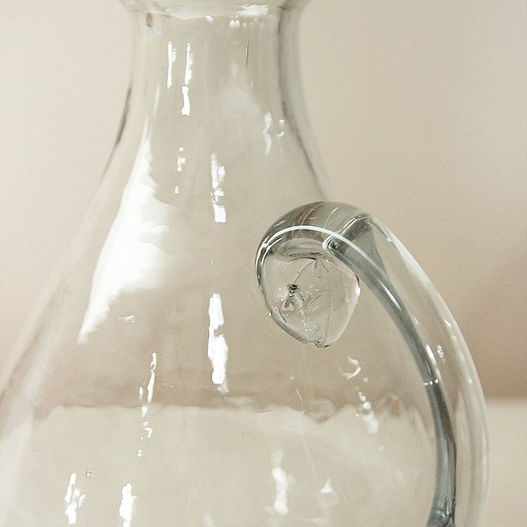 Durch den handwerklichen Herstellungsprozess können kleine Lufteinschlüsse im Glas sowie leichte, materialtypische Unregelmäßigkeiten am Griff entstehen, die den einzigartigen Charakter jedes Stücks ausmachen und jeder Karaffe ihren individuellen, authentischen Charme im Sinne eines echten Vintage-Looks verleihen. Jedes Stück ist ein Unikat.