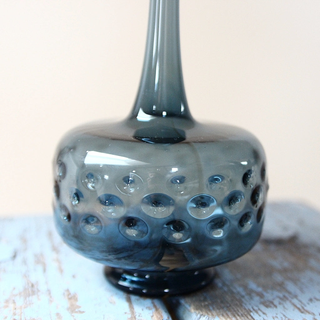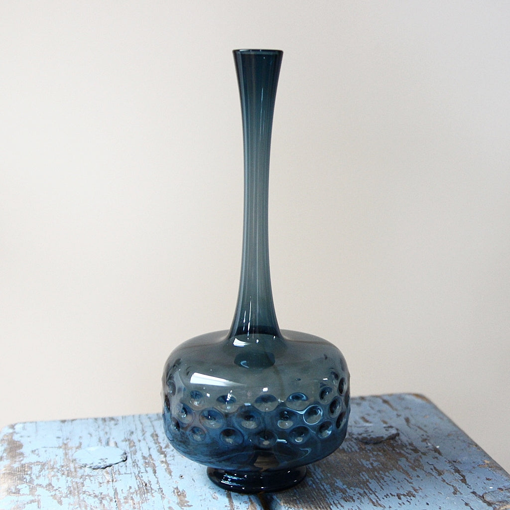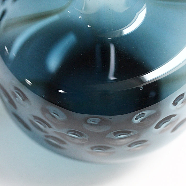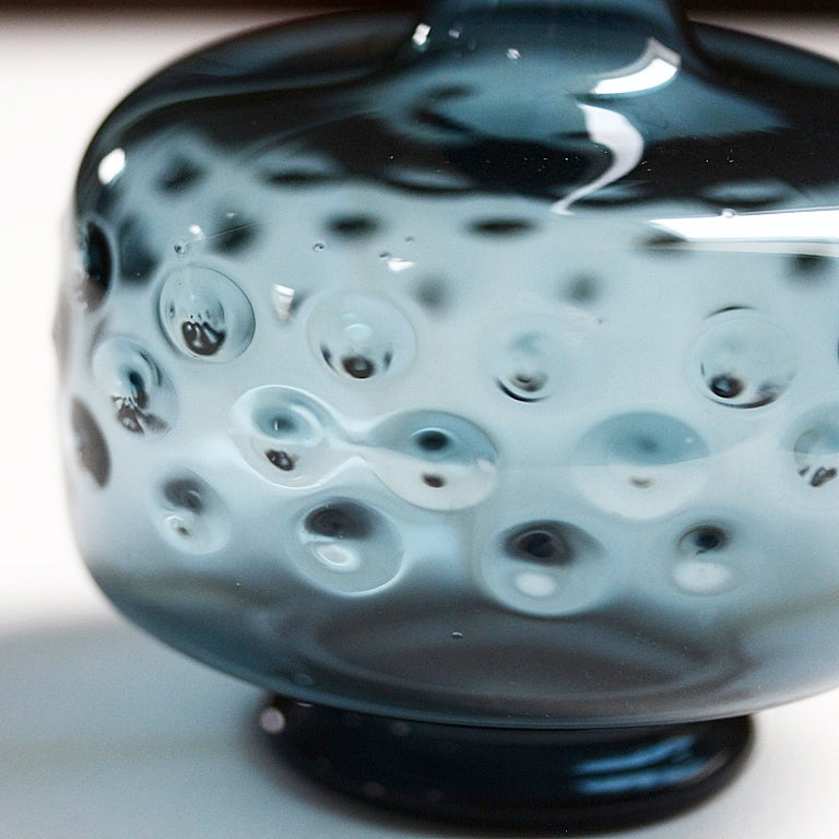 Das rauchig-blaue Glas wirkt edel und ruhig, während die plastische Noppenstruktur im unteren Bereich der Vase für spannende Licht- und Spiegelreflexe sorgt. Je nach Lichteinfall changiert sie zwischen transparentem Blau und dunklem Petrol – ein Objekt, das auch ohne Blumen sofort wirkt.
