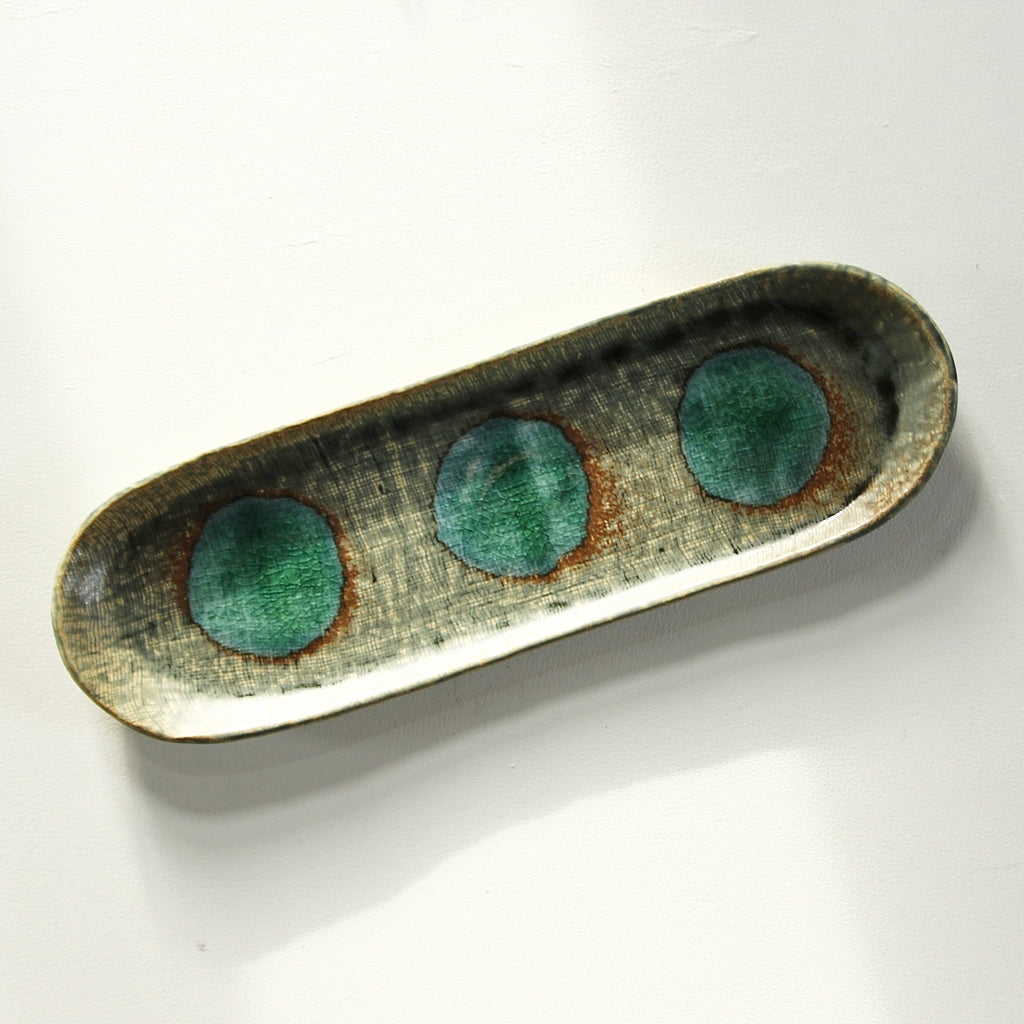 Eine längliche Keramikplatte mit unverwechselbarem Charakter. Die Long Ceramic Plate – Turquoise Circles verbindet eine dezente, leicht strukturierte Grundglasur mit drei kräftig türkisfarbenen Kreismotiven, deren feine Craquelé-Oberfläche für zusätzliche Tiefe sorgt.