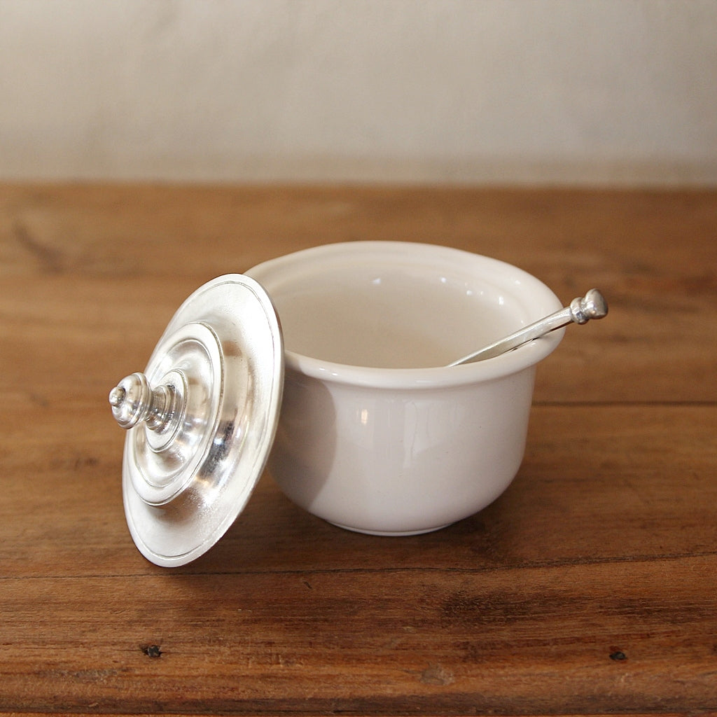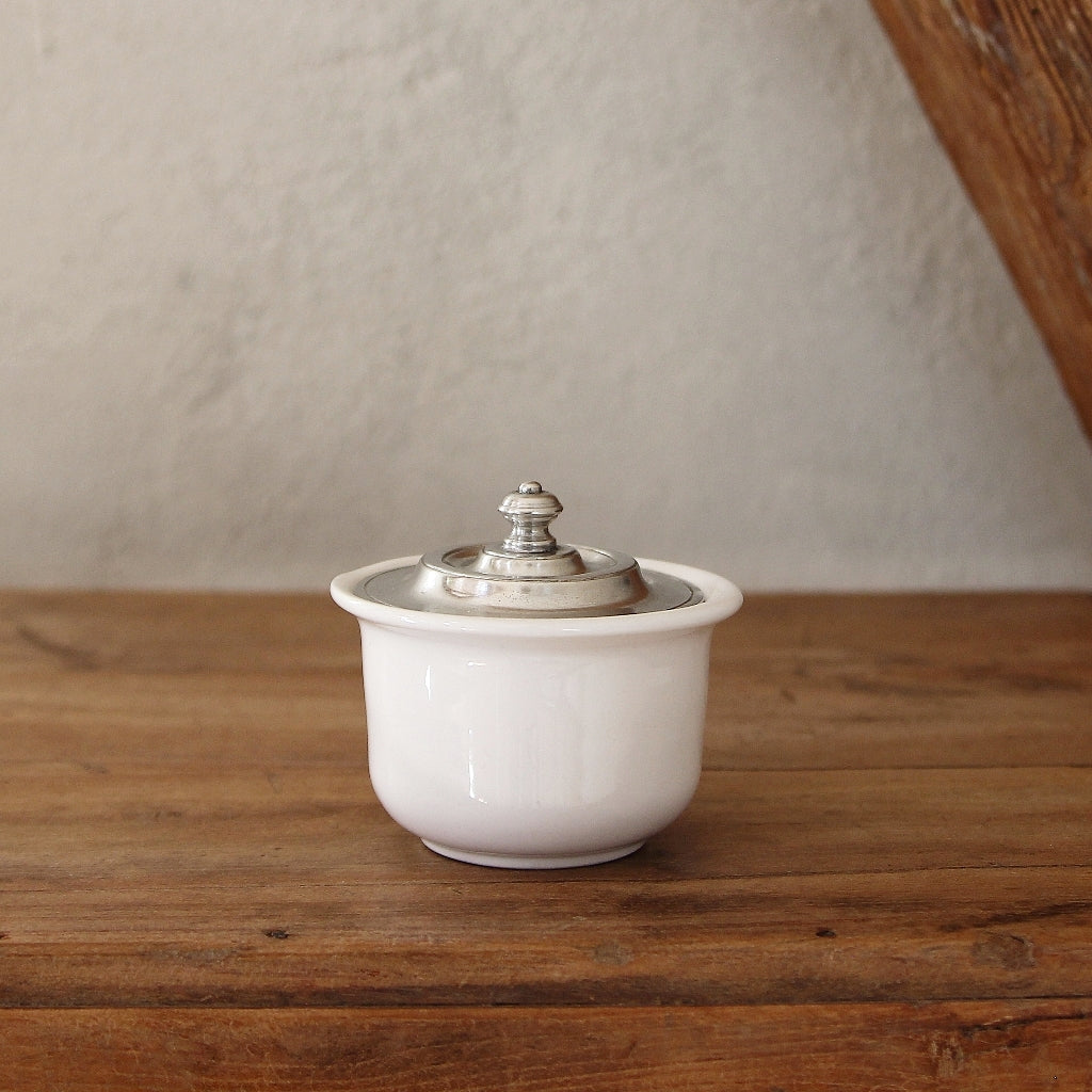 Diese Zuckerdose aus Zinn und weißer italienischer Keramik ist das perfekte Gefäß, um Würfelzucker oder losen Zucker aufzubewahren und zu servieren.