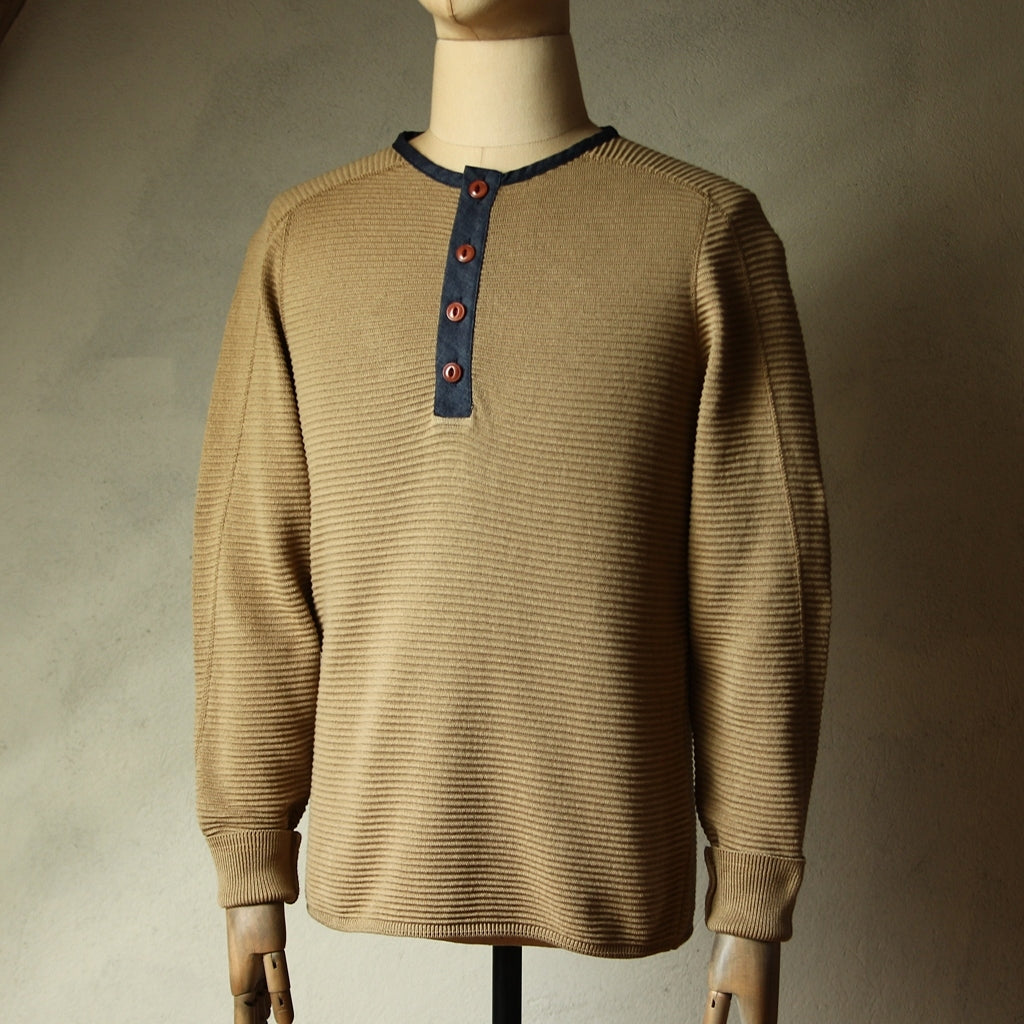 Gefertigt aus hochwertiger Baumwolle, bietet es angenehme Wärme und hohen Tragekomfort. Der runde Ausschnitt mit Vier-Knopf-Leiste, hinterlegt mit Denim-Stoff, verleiht dem Henley einen subtilen Kontrast und einen modernen, robusten Charakter. Die natürlichen Corozo-Knöpfe – gefertigt von Manufacture Corne & Corozo France – unterstreichen die handwerkliche Qualität.