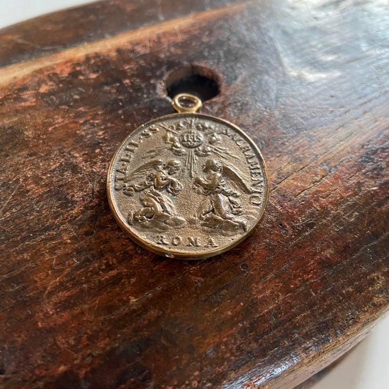 Wunderschöne, fein gearbeitete katholische Medaille aus Messing, gefertigt in Rom. Beidseitig geprägt mit religiösen Darstellungen und lateinischen Inschriften – ein authentisches Zeugnis römischer Wallfahrtskultur.