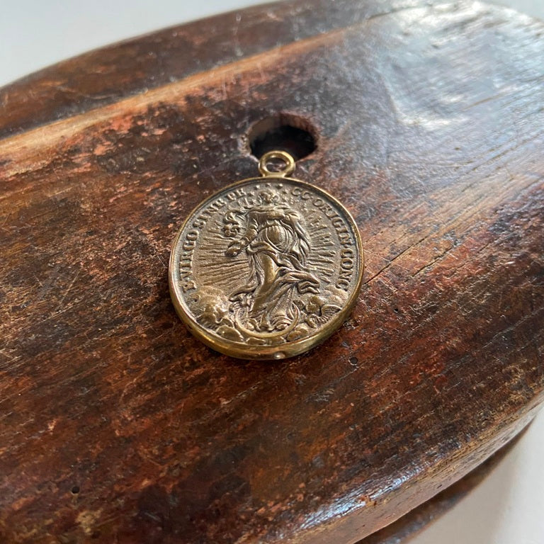 Die Vorderseite zeigt die Heilige Jungfrau Maria, die Rückseite das Motiv des Heiligen Sakraments. Ein besonderes Sammlerstück mit ehrwürdiger Patina und spirituellem Charakter – ideal als Anhänger, Glücksbringer oder historische Dekoration.