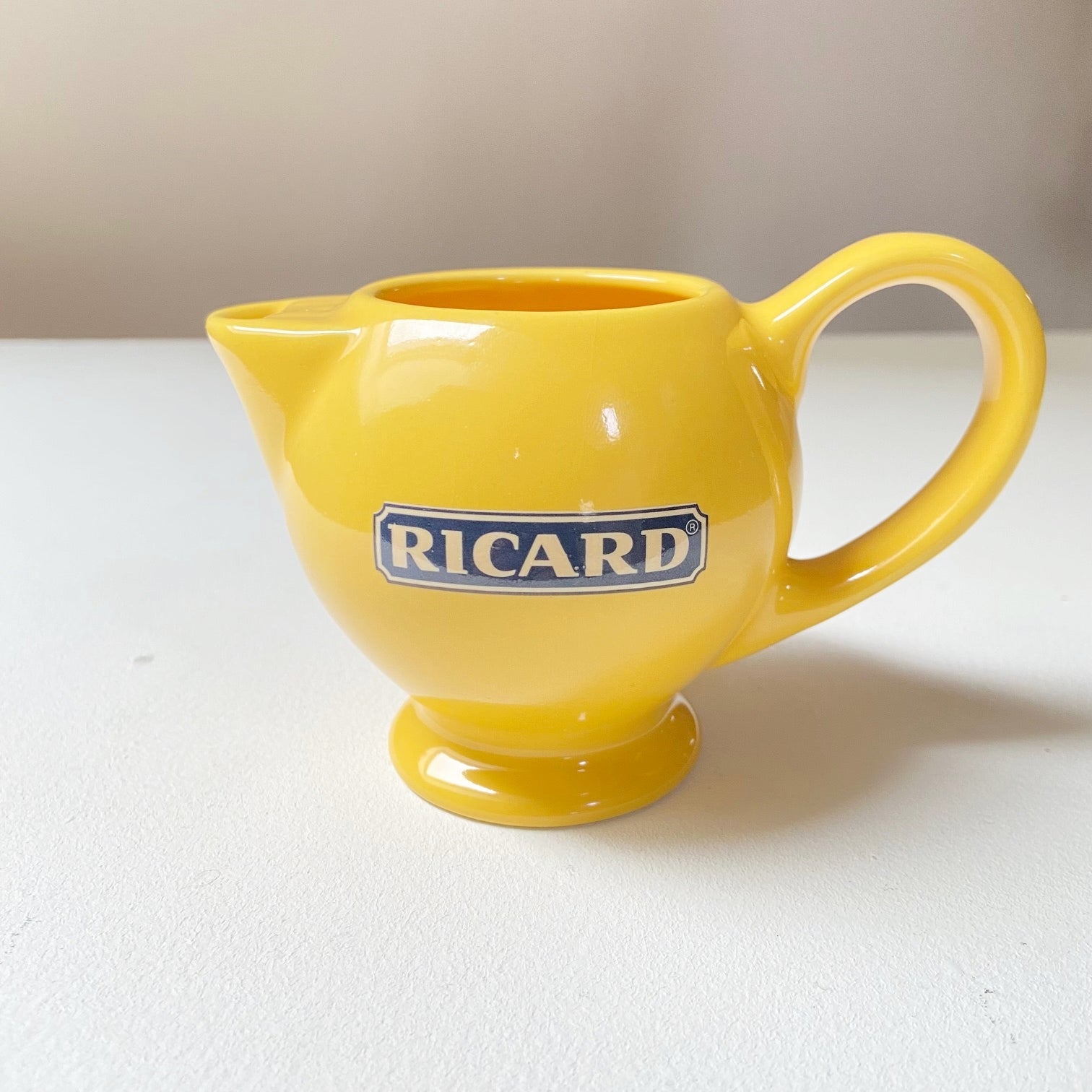 Das leuchtende Gelb mit blauer „Ricard“-Aufschrift auf beiden Seiten macht diesen Krug zu einem echten Blickfang und beliebten Sammlerstück für Freunde französischer Barkultur.