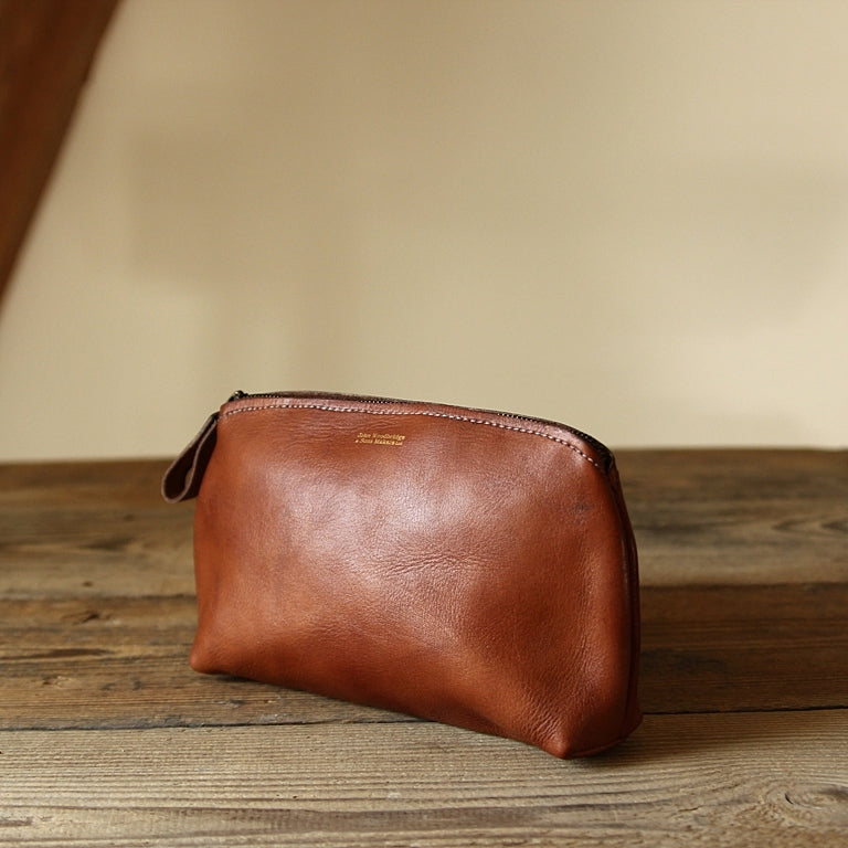 Crafted from thick full-grain leather, the pouch impresses with its pleasant flexibility and high durability. The wide zipper ensures easy access, while the subtle patina finish gives the leather an individual, characterful look over time.