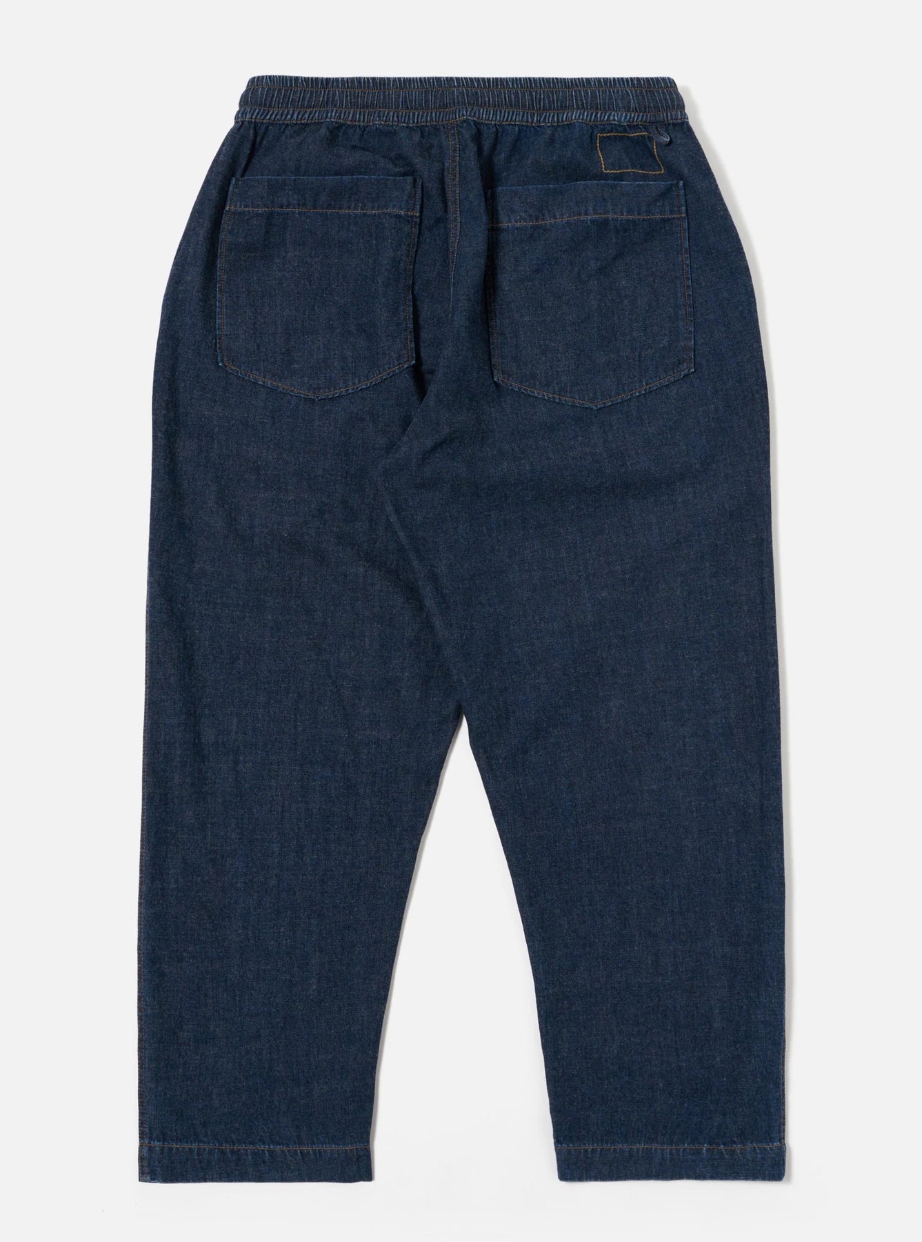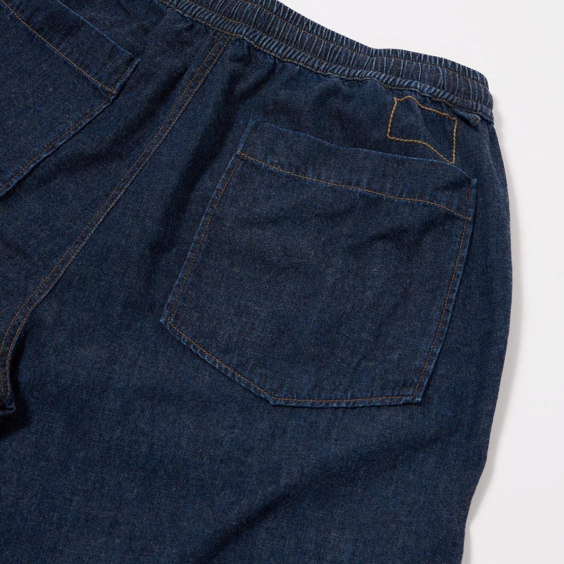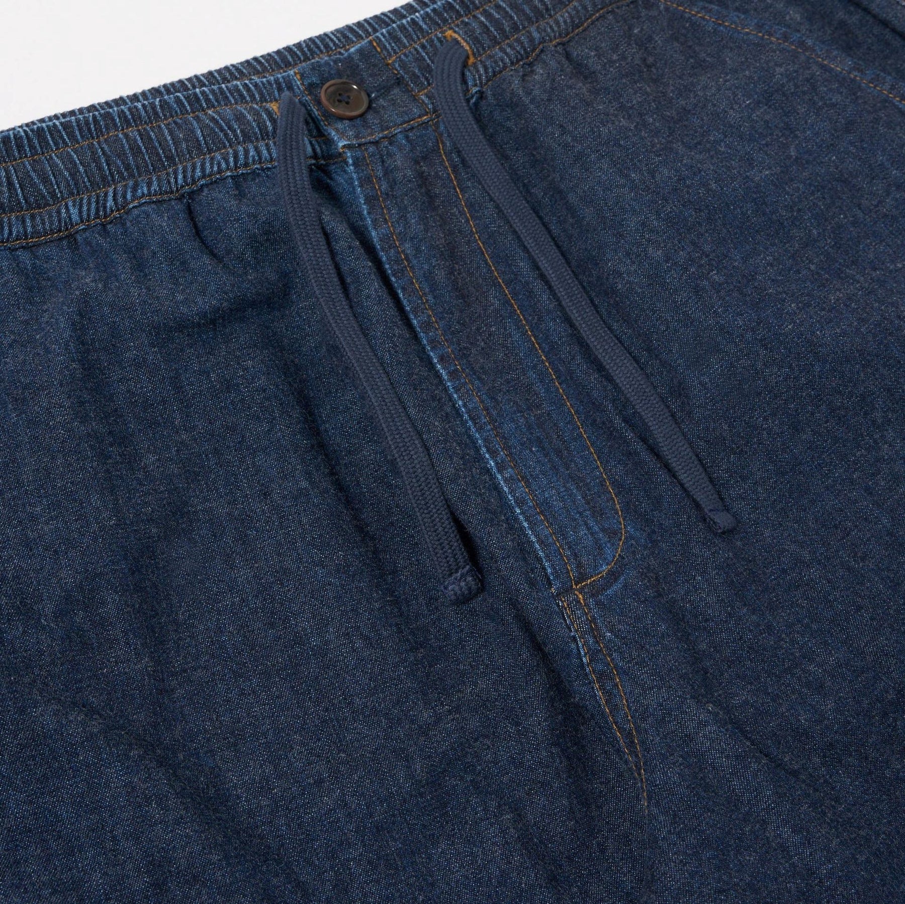 Gefertigt aus leichtem 7.5 oz Kaihara Denim aus Japan – einem der renommiertesten Denim-Webereien weltweit – fühlt sich der Stoff angenehm luftig an und eignet sich ideal für wärmere Tage. Der elastische Bund mit Kordelzug sorgt für zusätzlichen Tragekomfort und macht die Hose besonders unkompliziert im Alltag.