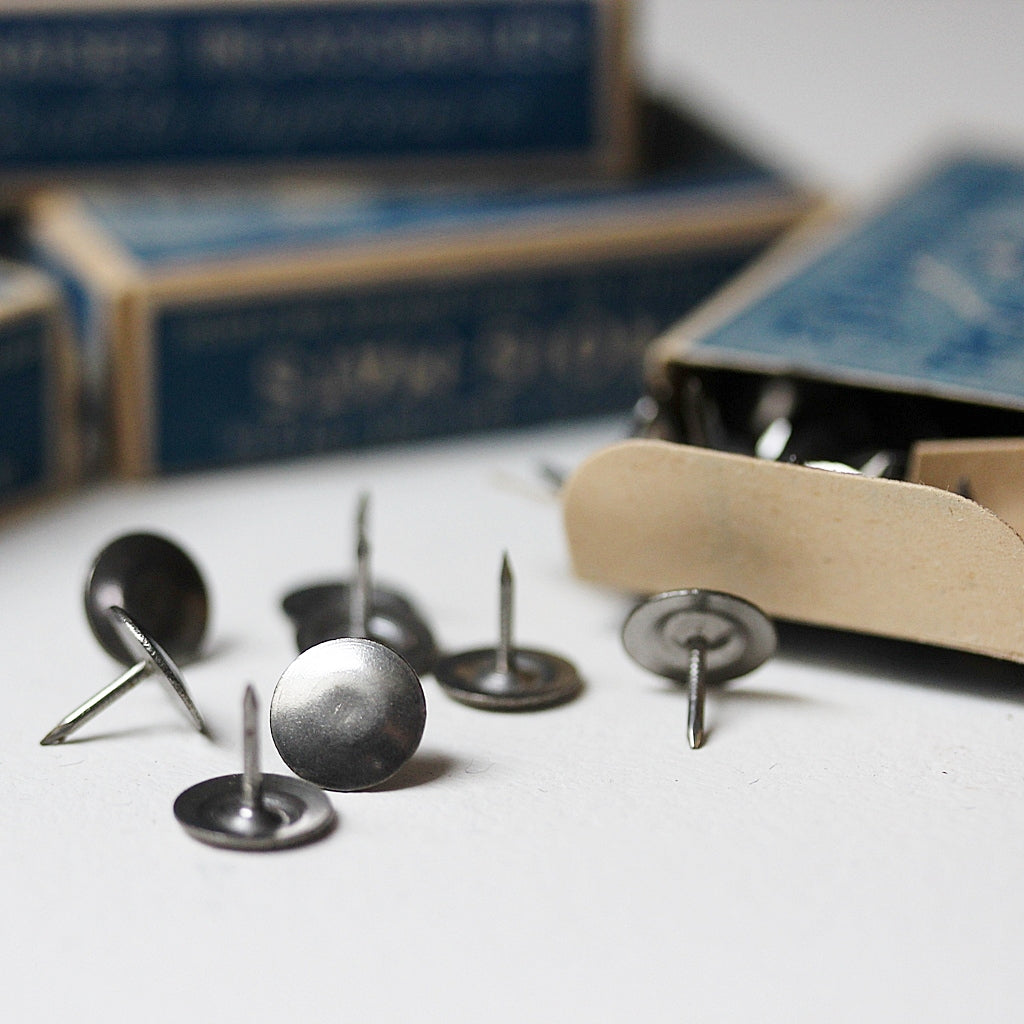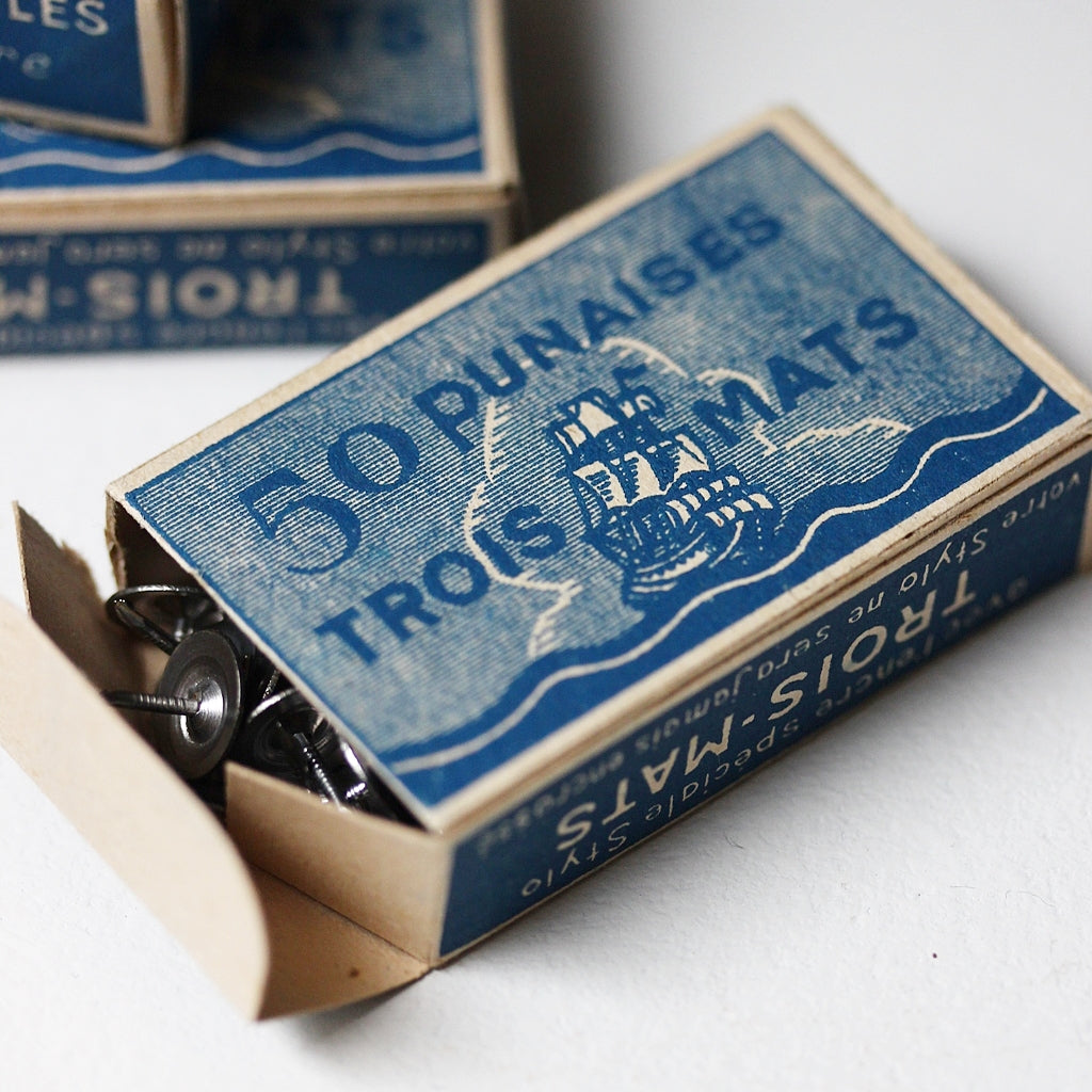 Ces punaises anciennes de la marque Trois Mats sont une petite relique pleine de caractère de la culture passée du bureau et de l'écriture. Emballées dans leurs boîtes originales au design graphique, elles racontent une époque où même les objets du quotidien étaient fabriqués avec soin et un sens du design.